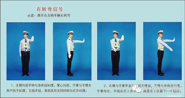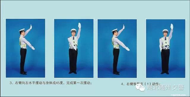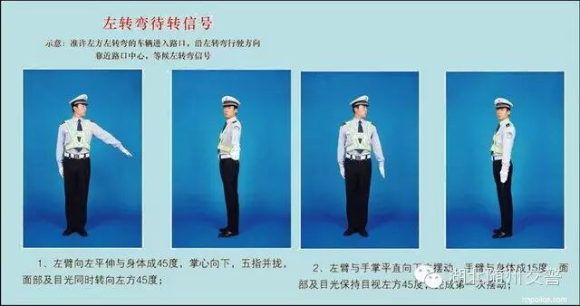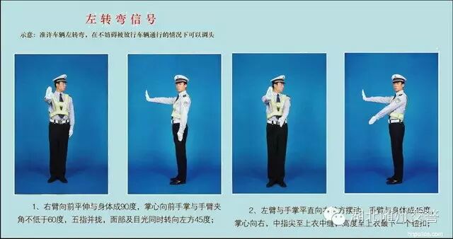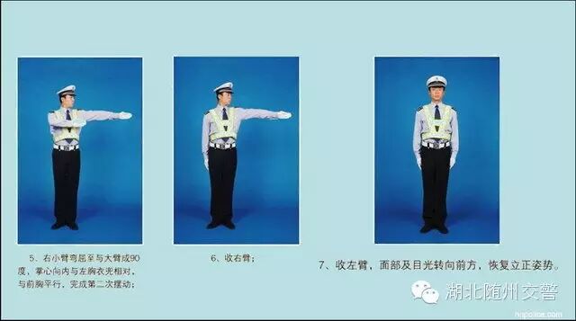 (三)左转弯信号:右臂向前平伸,掌心向前;左臂与手掌平直向右前方摆动,掌心向右,准许车辆左转弯,在不妨碍被放行车辆通行的情况下可以掉头。