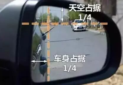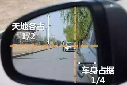 把水平线置于后视镜的中线位置,然后再把车身的边缘调整到占据镜面影像的1/4。
